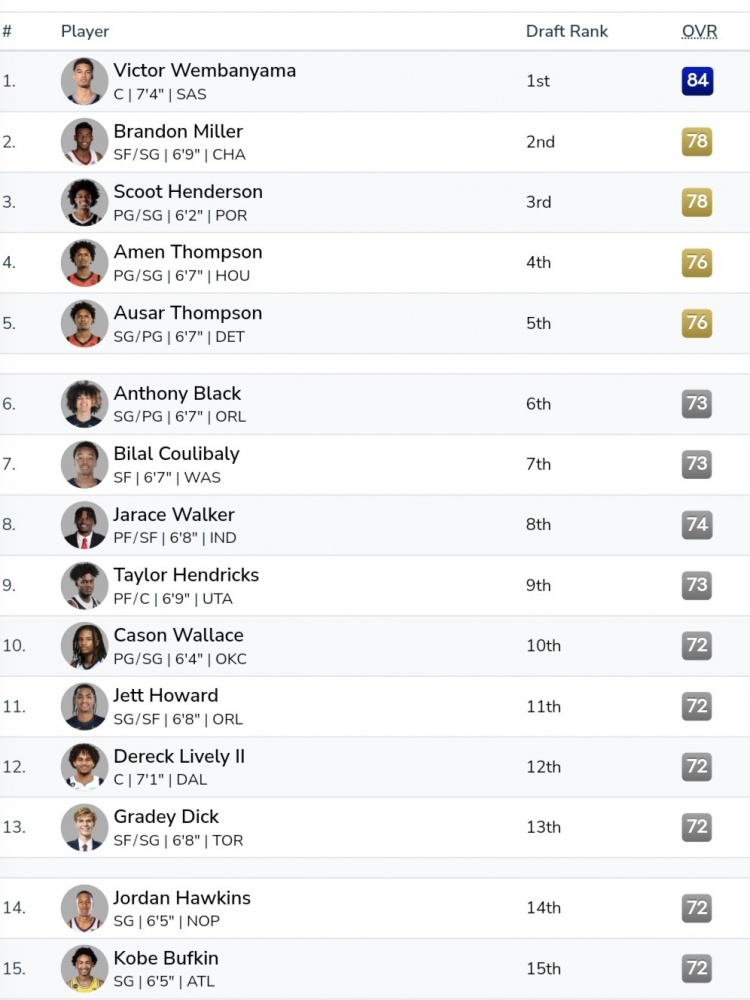 在本届的新秀能力值方面,状元文班亚马以84遥遥领先,榜眼布兰登-米勒和探花斯库特-亨德森排名并列第二,汤普森兄弟并列第四。